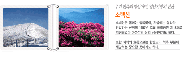 ¹ÝµµÀÇ µî»À°ÝÀΠŹé»ê¸ÆÀÇ ÁٱⰡ ¼³²ÂÊÀ¸·Î »¸¾î³»·Á °¿øµµ, ÃæÃ»µµ, °æ»óµµ¸¦ °¥¶ó Å« »ê°è¸¦ ÀÌ·ç°í ¾Æ¸§´Ù¿î °ü±¤µµ½Ã ´Ü¾çÀÇ ÁöºØÀ¸·Î ÀÚ¸®Çϰí ÀÖ´Ù. ÇüÁ¦ºÀÀ» ½ÃÀÛÀ¸·Î ³²ÂÊ »ê¸ÆÀ» µû¶ó ½Å¼±ºÀ, ±¹¸ÁºÀ, ºñ·ÎºÀ, ¿¬ÈºÀ, ÇüÁ¦ºÀµî ¸íºÀµéÀÌ ±¸ºñÄ¡¸é¼ º½¿¡´Â öÂßÀÌ Èåµå·¯Áö°Ô ÇǾî õÀÚ¸¸È«À» ÀÌ·ç°í ³ì¼öû»ê°ú ¸¸»êÈ«¿±À¸·Î ööÀÌ ´ÜÀåÇÏ´Ù°¡ °Ü¿ïÀÌ¸é ¹é»öÃÊÁöÀÇ ¼³°æ°ú ´«²É ±×¸®°í ¸Á¸Á¿îÇØ°¡ Àå°üÀ» ÀÌ·ç¾î Çѱ¹ÀÇ ¾ËÇÁ½º¸¦ ¿¬»óÄÉ ÇÑ´Ù. ¼Ò¹é»êÀÇ ÁÖºÀÀÎ ºñ·ÎºÀ(1,439m)Àº Èñ±Í½Ä¹°ÀÎ ¿¡µ¨¹ÙÀ̽º°¡ öÂß°ú ¾Ó»óºíÀ» ÀÌ·ç°í ¿¹·ÎºÎÅÍ ¿Õ½ÇÀÇ °¡±¸Á¦·Î ¾²¿©Á³´ø ÁÖ¸ñÀÌ ±º¶ôÀ» ÀÌ·ç°í ÀÖ´Ù. ÁÖ¸ñÀº »ì¾Æ¼ õ³â Á×¾î¼ Ãµ³âÀ» »ê´Ù°í ÇÒ¸¸Å ÁúÀÌ ´Ü´ÜÇÏ°í ±ÁÁö ¾Ê´Âµ¥ ÃÖ±Ù¿¡´Â 60³â»ý ÁÖ¸ñ ÇÑ ±×·ç¸é ÇÑ»ç¶÷ÀÇ ¾ÏÀ» Ä¡·áÇÒ ¼ö ÀÖ´Â Ç׾Ϲ°ÁúÀ» ÃßÃâÇÒ ¼ö ÀÖ´Ù°í ÇÑ´Ù. [±¹¸ÁºÀ(1,420m) ] [ºñ·ÎºÀ(1,439m)] Á¶¼±ÀÇ À¯¸íÇÑ ½ÇÇÐÀÚ ³²»ç°í´Â Á×·ÉÀ» Áö³ª´Ù°¡ ÀÌ»êÀ» ¹Ù¶óº¸°í ¡¸»ç¶÷ »ì¸® ´Â »ê¡¹À̶ó¸ç ¸»¿¡¼ ³»·Á ³ÒÁ× ÀýÀ» Çϰí Áö³ª°¬´Ù ÇÑ´Ù. [¿¬ÈºÀ(1,394m)] À̰÷¿¡´Â Çѱ¹ÀüÀÚÅë½Å¿¬±¸¼ÒÀÇ ±¹¸³Ãµ¹®´ë¿Í °ø±º Åë½Å´ë°¡ ÀÚ¸®Àâ°í ÀÖ¾î ¿ì¸®³ª¶ó õ¹®°øÇÐÀÇ ¿ä¶÷ÀÌ¸ç ¼Ò¹é»êÀÇ ¿©·¯Áٱ⿡¼ ¿À¸£´Â µî»ê·ÎÀÇ ÇÕ·ùÁöÁ¡ÀÌ´Ù. Èò±¸¸§ ¹«¸®¿¡ µé°ÔµÇ¸é ½Å¼±ÀÌ µÇ¾î ±¸¸§À» Ÿ°í ³¯¾Æ ´Ù´Ï´Â ȯ»ó¿¡ ºüÁ® µé°ïÇÑ´Ù. [½Å¼±ºÀ(1,389m)] ¹ÙµÏÆÇÀÌ ÀÖ´Â ¹ÙÀ§¿¡ µÎ»ç¶÷ÀÌ ¾ÉÀ¸¸é ±¸¸§À§¿¡ ¶°ÀÖ´Â ±âºÐÀ» ÁØ´Ù. [ÇüÁ¦ºÀ(1,177m)] ÀÏÁ¦½Ã´ë¿¡ º¯Àå¼ú¿¡ ´ÉÇϰí ÃàÁö¸¦ ÇÏ¸ç ¹é¹ß¹éÁßÀÇ ¸í»ç¼ö·Î¼ µ¶¸³±ºÀÇ ÀÚ±ÝÀ» ¸¸ÁÖ·Î